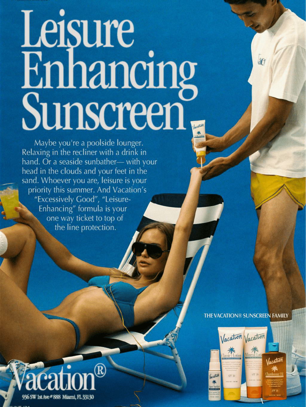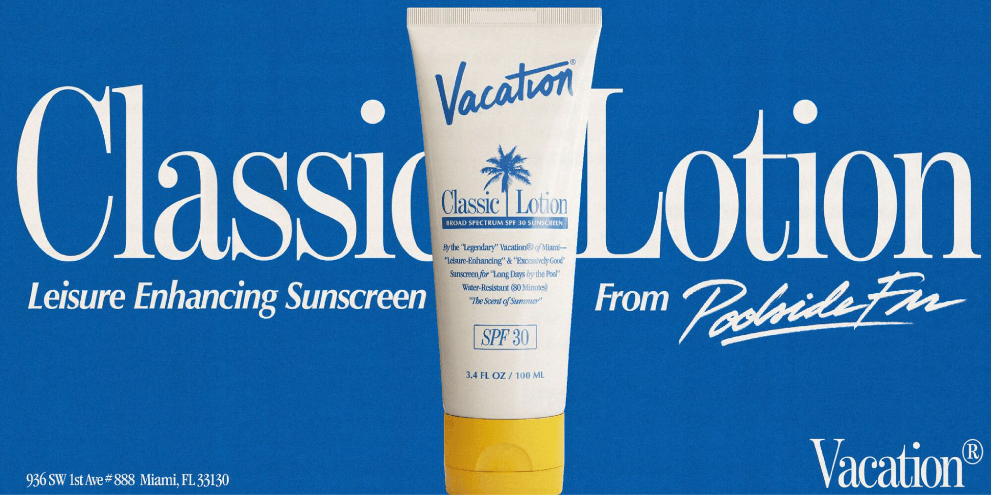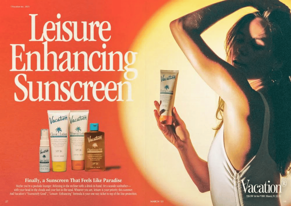 Vacation is a sunscreen brand that launched in 2021 looking like it was designed on the set of Miami Vice. Hand-scribbled logo. Serifs. Kerning and hierarchy that feels like it was pulled from a VHS tape. And it's not just the type, the photography, the art direction, the whole thing is drenched in 1980s nostalgia.